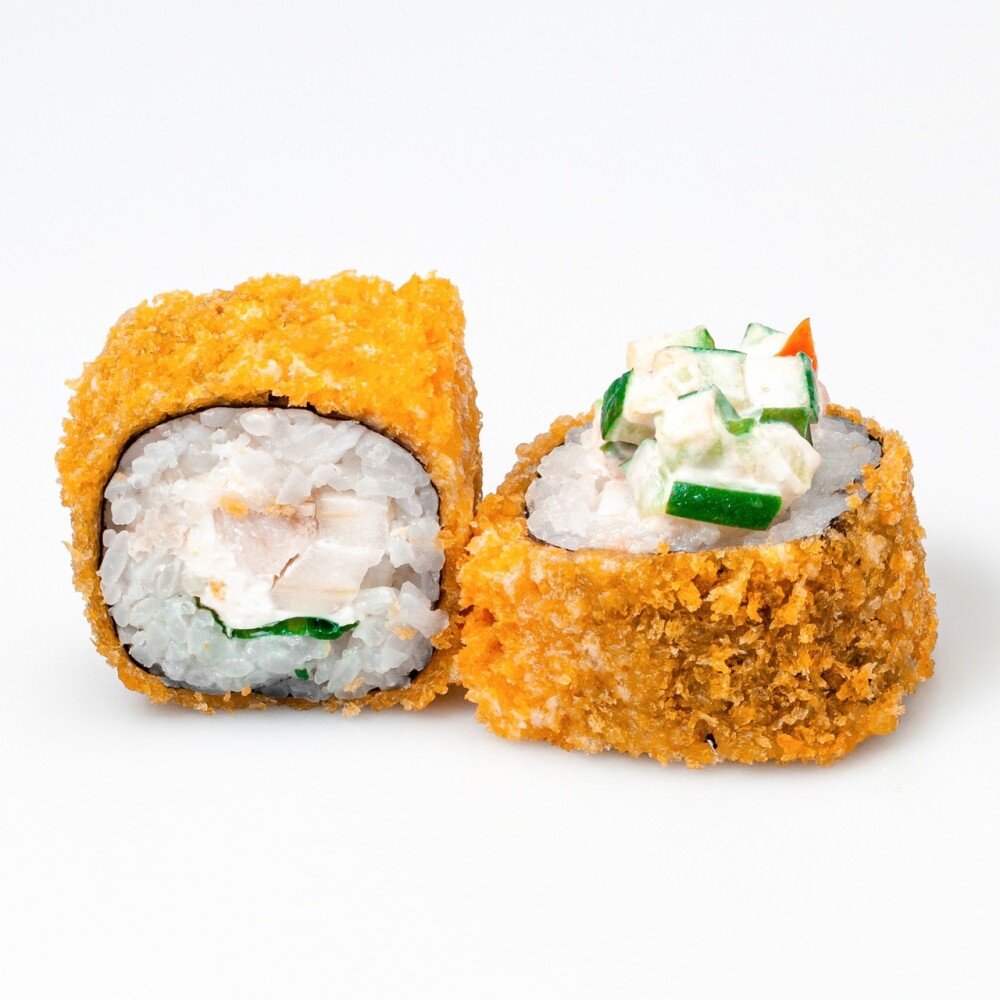 Жареная курочка, рис,сливочный сыр, майонез, огурец, помидор, зеленый лук, салат, кляр, «Панко»