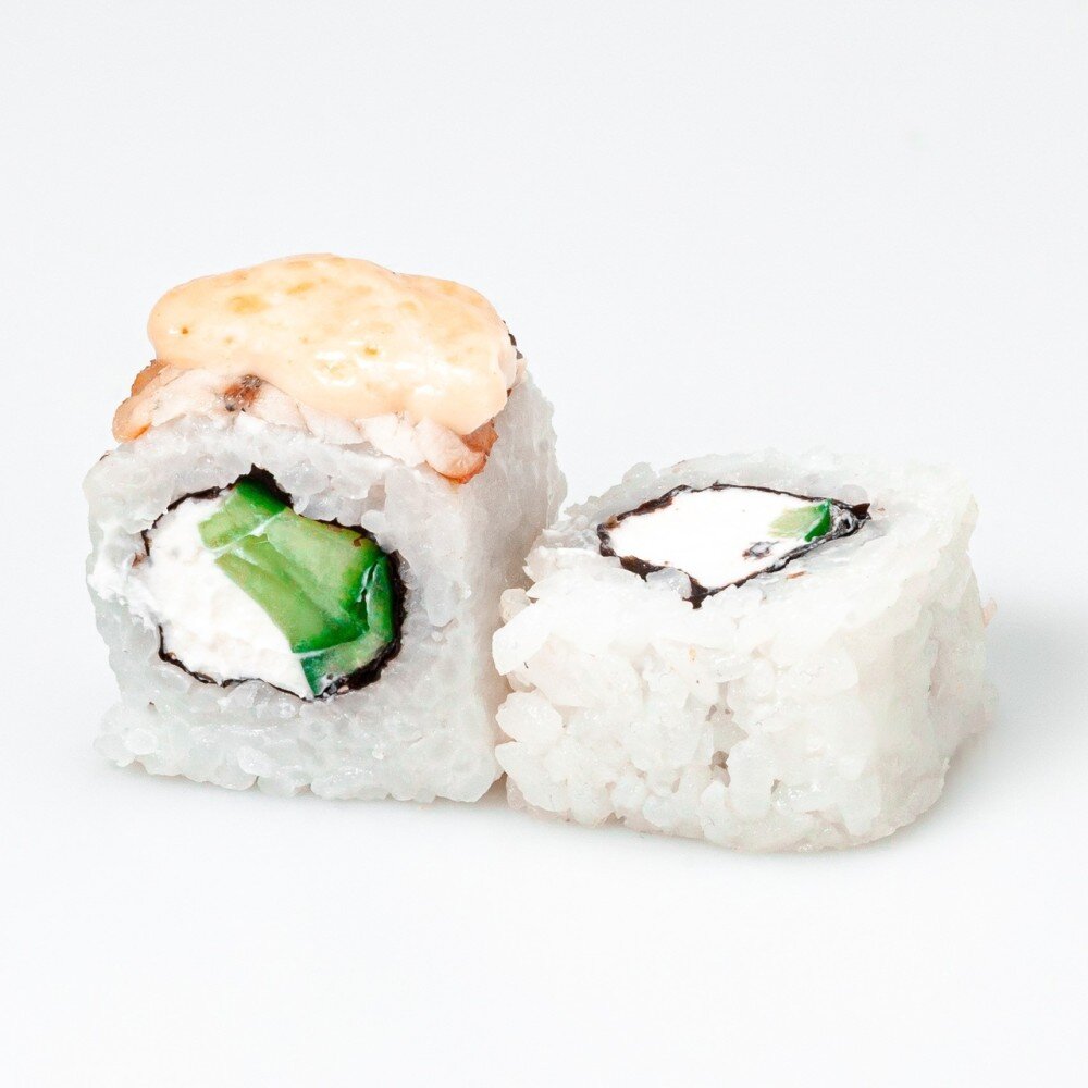 Сливочный сыр, огурец, шапка из угря и шапка из соуса Унаги гриль