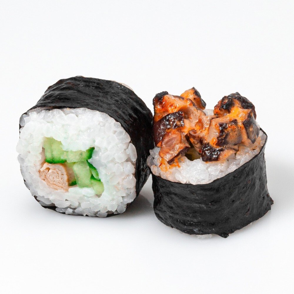 Огурец, омлет Тамага, шапка из Острого соуса и грибов Шиитаке