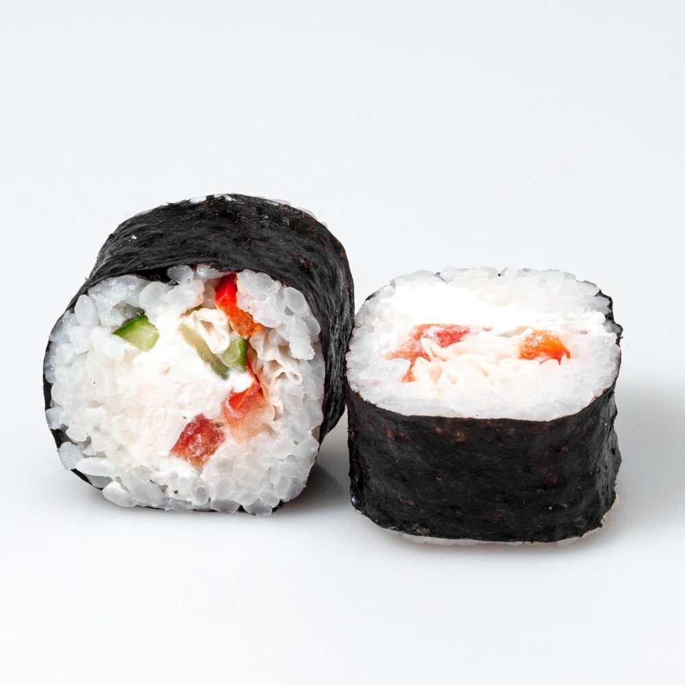 Сливочный сыр, рис,помидор, огурец, пекинская капуста, болгарский перец.