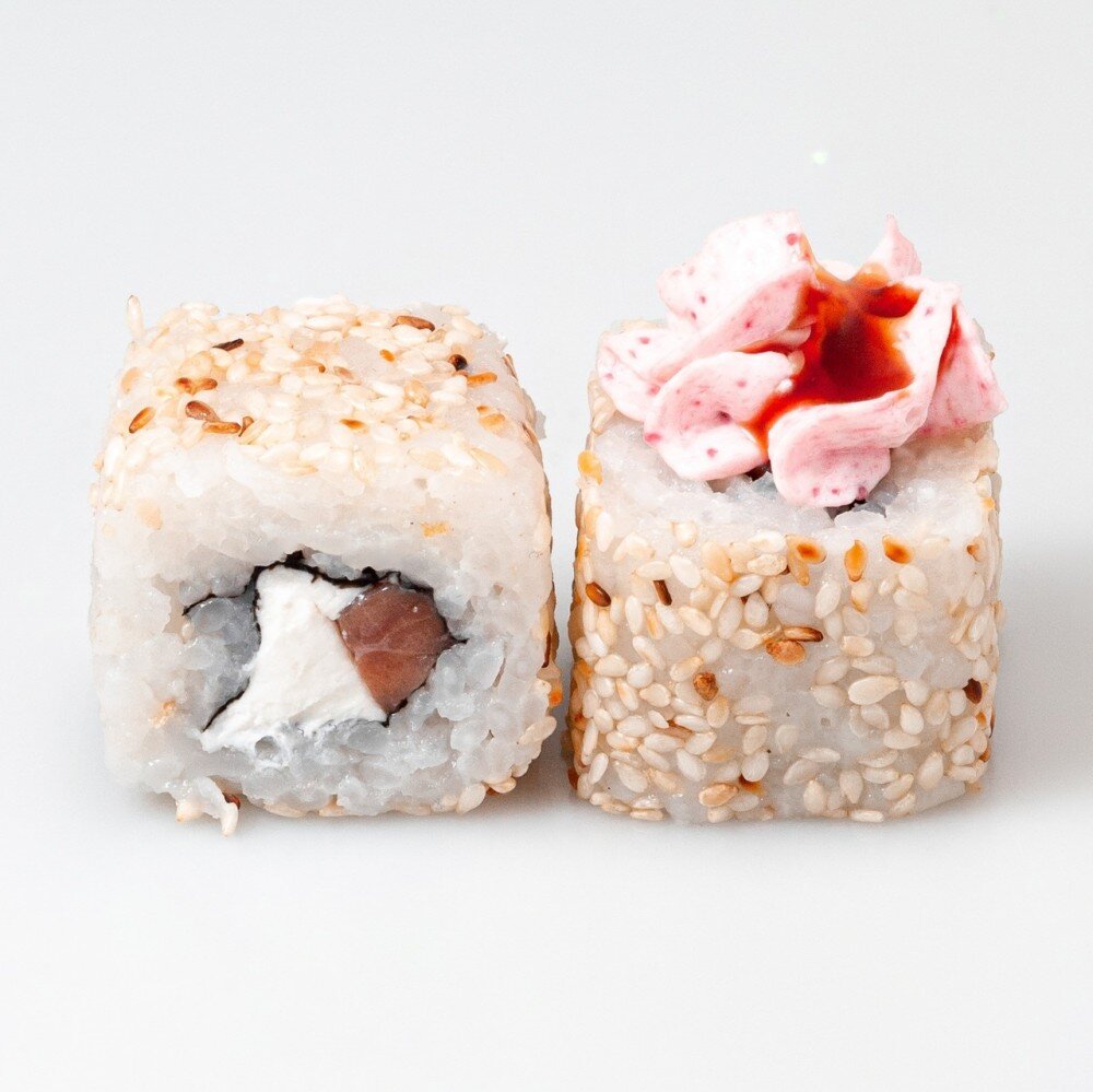 Сливочный сыр, лосось, обвален в кунжуте, шапка из соуса «Лава», полит соусом «Унаги».