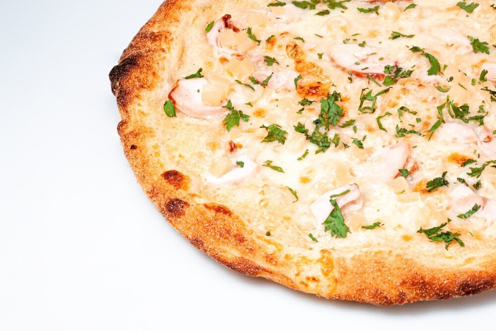 Моцарелла, сливочный соус, копчёная курица, консервированный ананас, петрушка