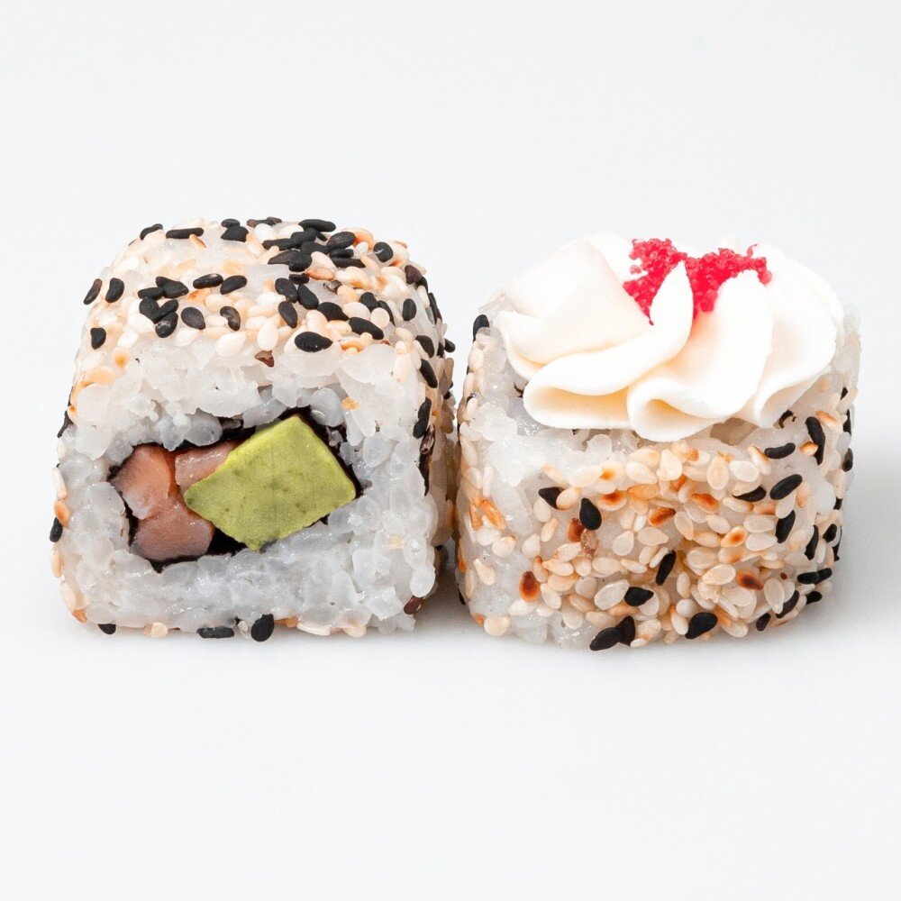 Рис, авокадо, лосось, обвален в кунжуте, шапка из сыра и икры Масаго