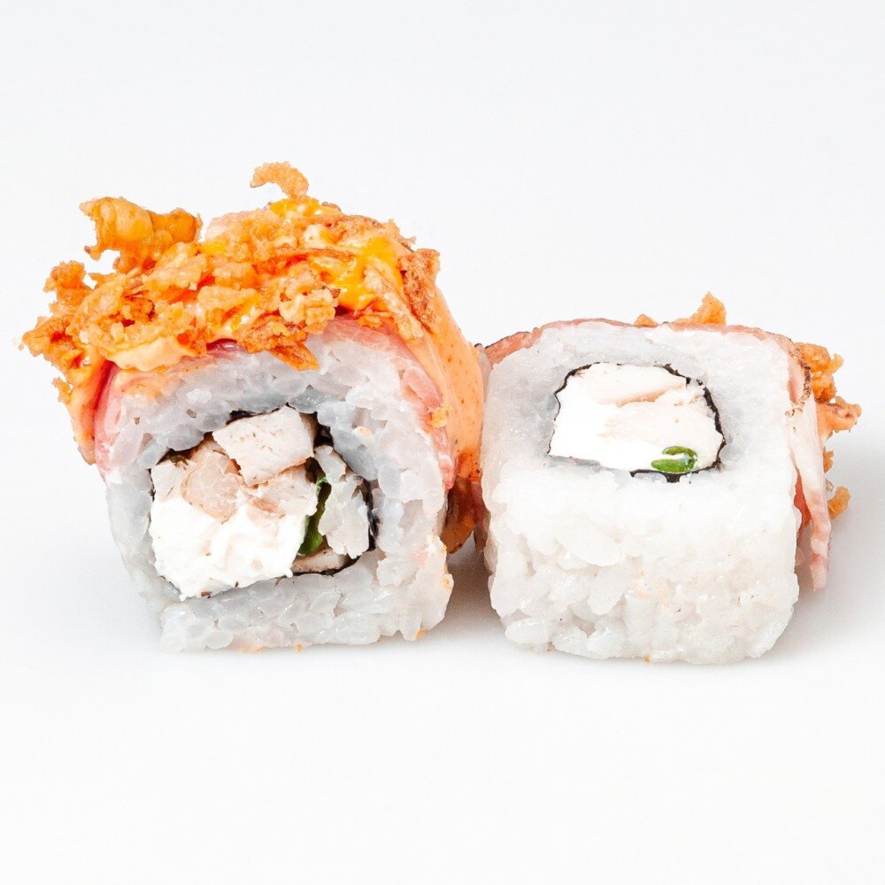 Рис, сыр, жареная курочка, зелёный лук, обёрнут в копчёный бекон, полит соусом Спайси и посыпан жареным луком