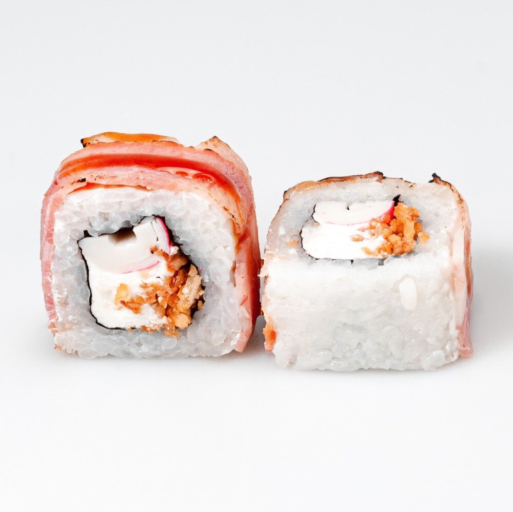 Рис, сливочный сыр, крабовое мясо, жареный лук, обёрнут в опалённый бекон, полит соусом барбекю