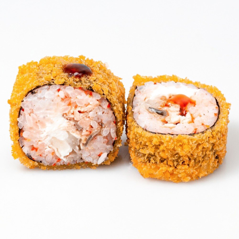 Рис с икрой масаго, сливочный сыр, лосось терияки, пекинская капуста,кляр, сухари "Панко", полит соусом унаги, посыпан кунжутом
