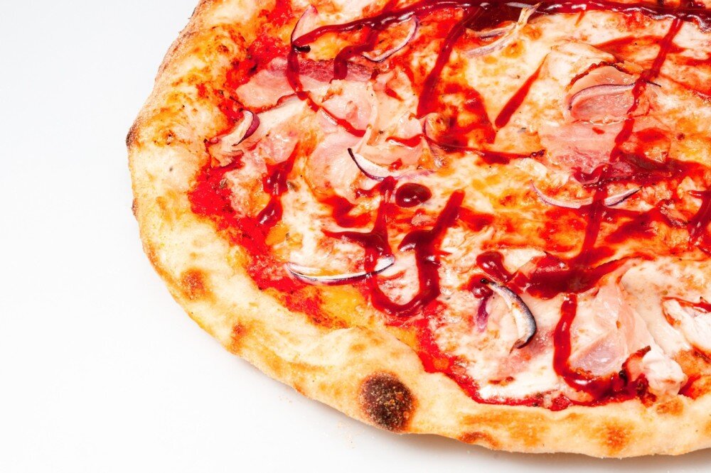 Томатный соус, моцарелла, копчёная курочка, бекон, красный лук, соус барбекю