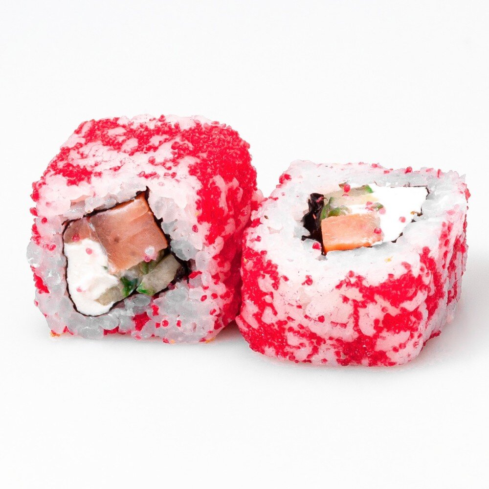 Сливочный сыр, огурец, лосось копченый, обвален в красной «Масаге», посыпан кунжутом, полит соусом «Унаги»