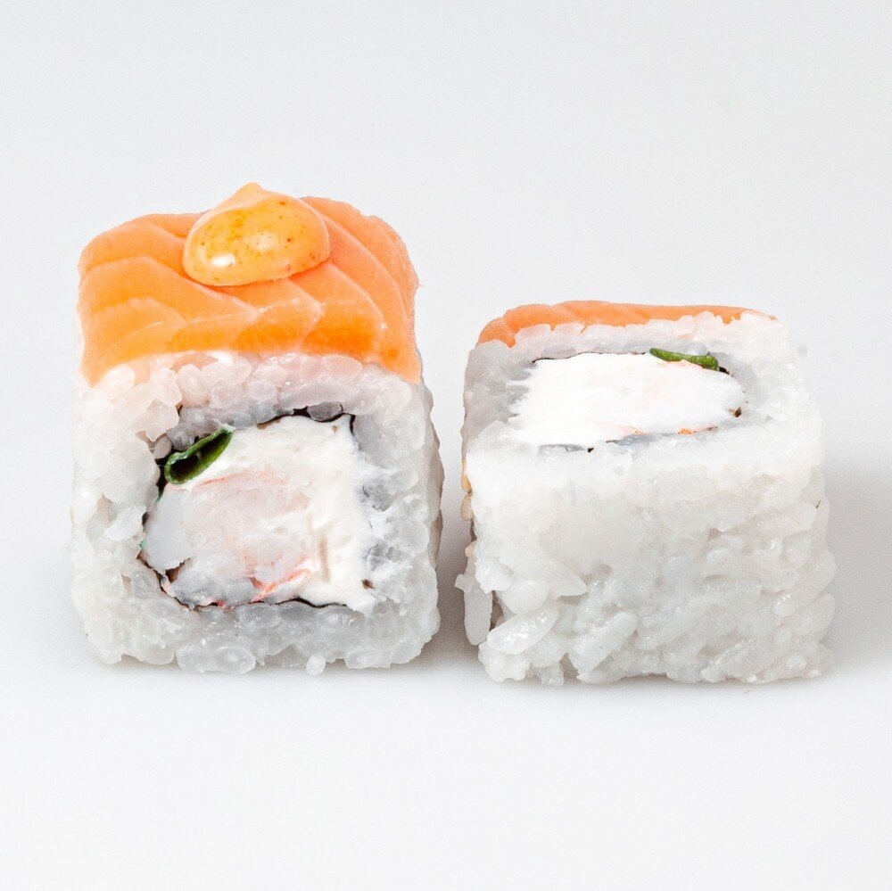 Сливочный сыр,рис, креветка, зеленый лук, шапка из лосося, полит соусом "Спайси".