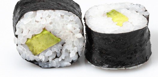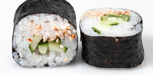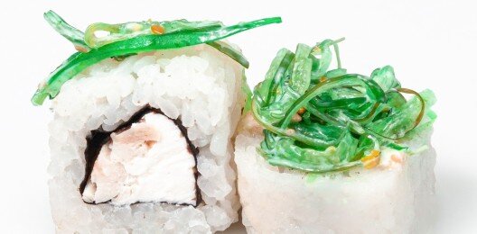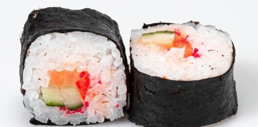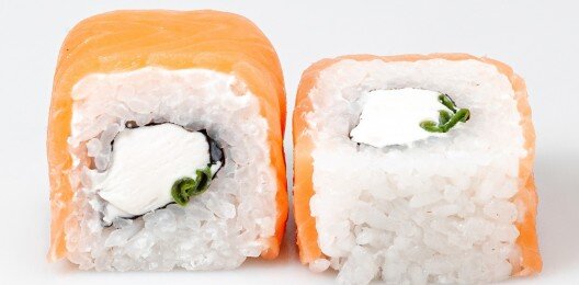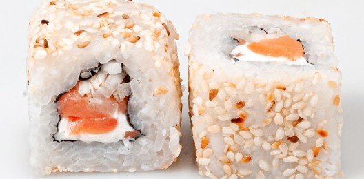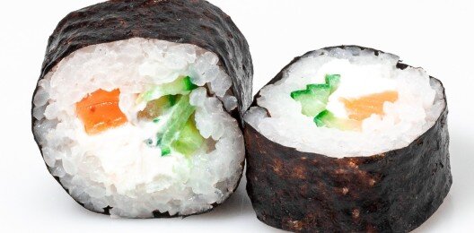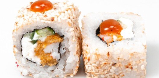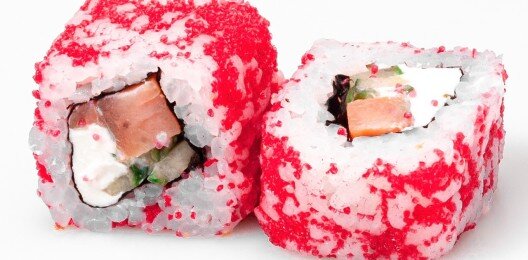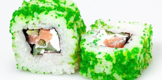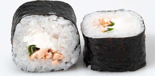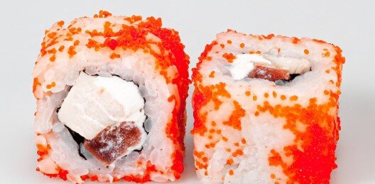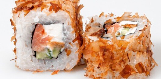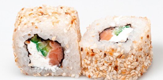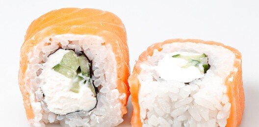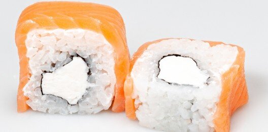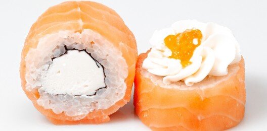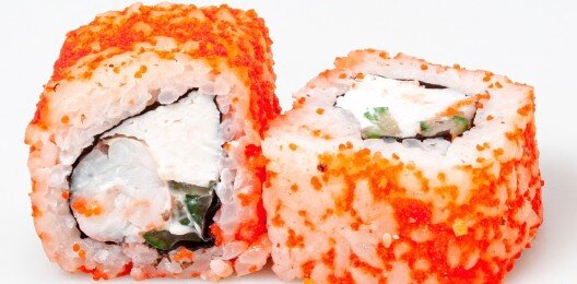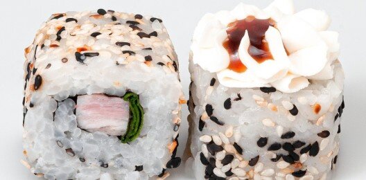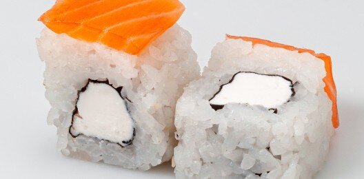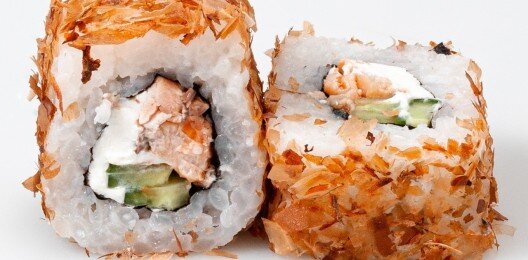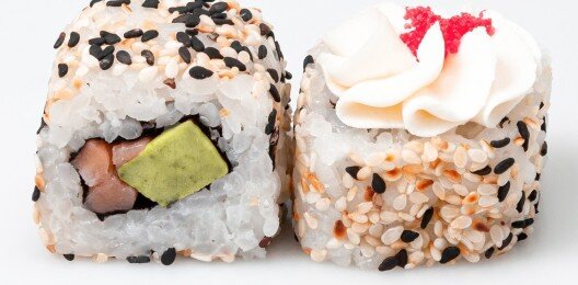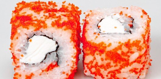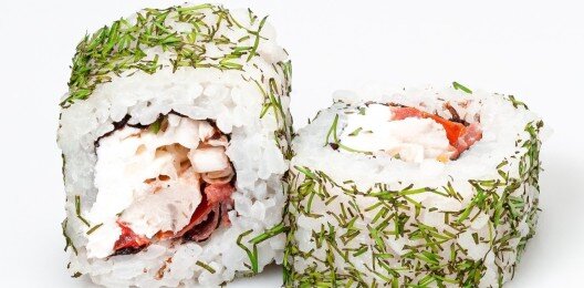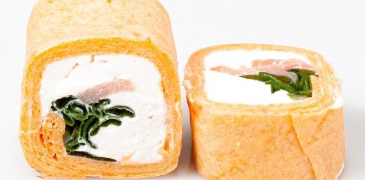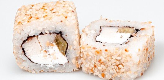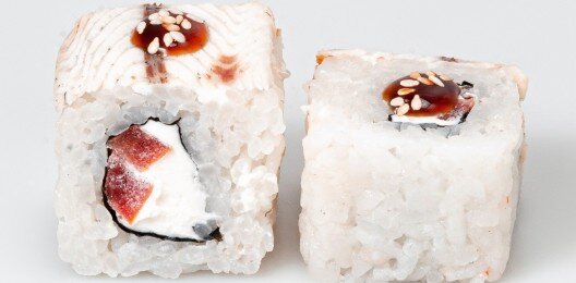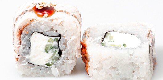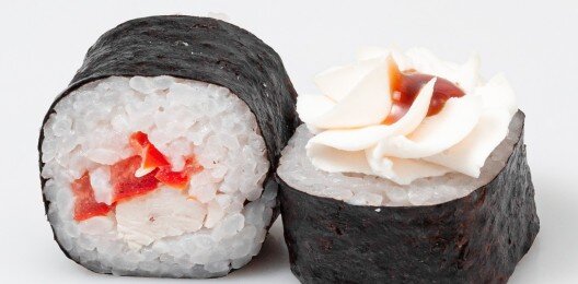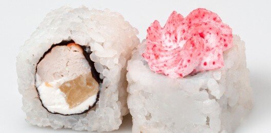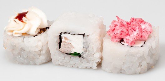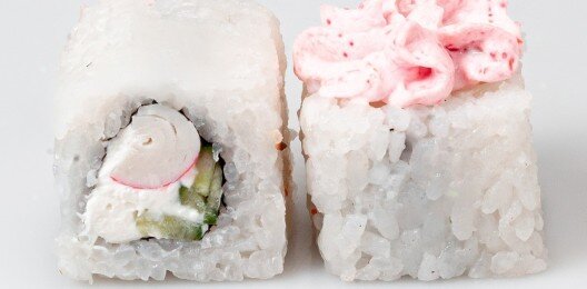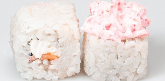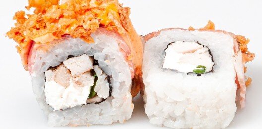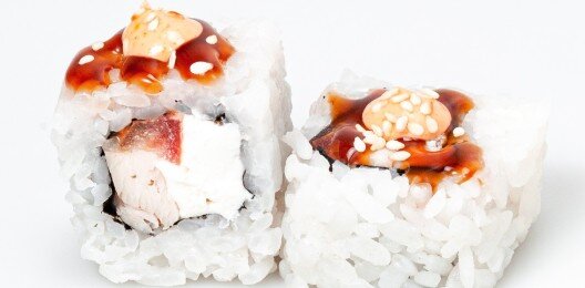 Сливочный сыр,рис, жареная курочка, огурец, шапка из соуса «Лава».