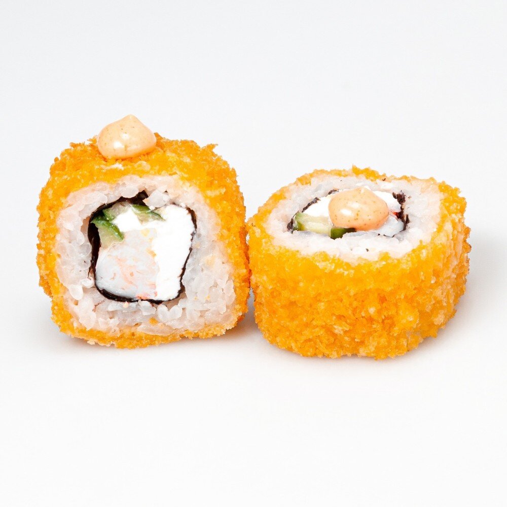 Сливочный сыр, рис,креветка, огурец, кляр, сухари «Панко», полит соусом «Спайси»