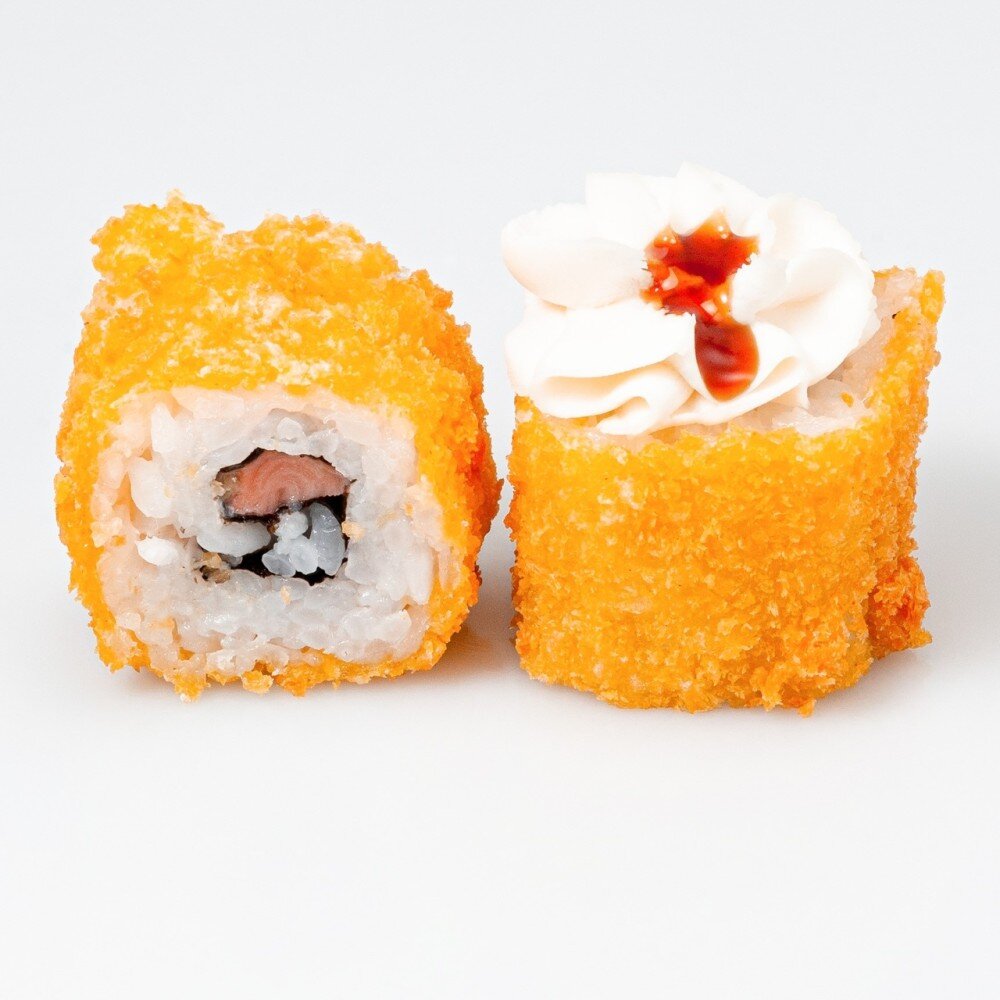 Сливочный сыр, рис,лосось, кляр, сухари «Панко», шапка из сливочного сыра, полит соусом «Унаги»