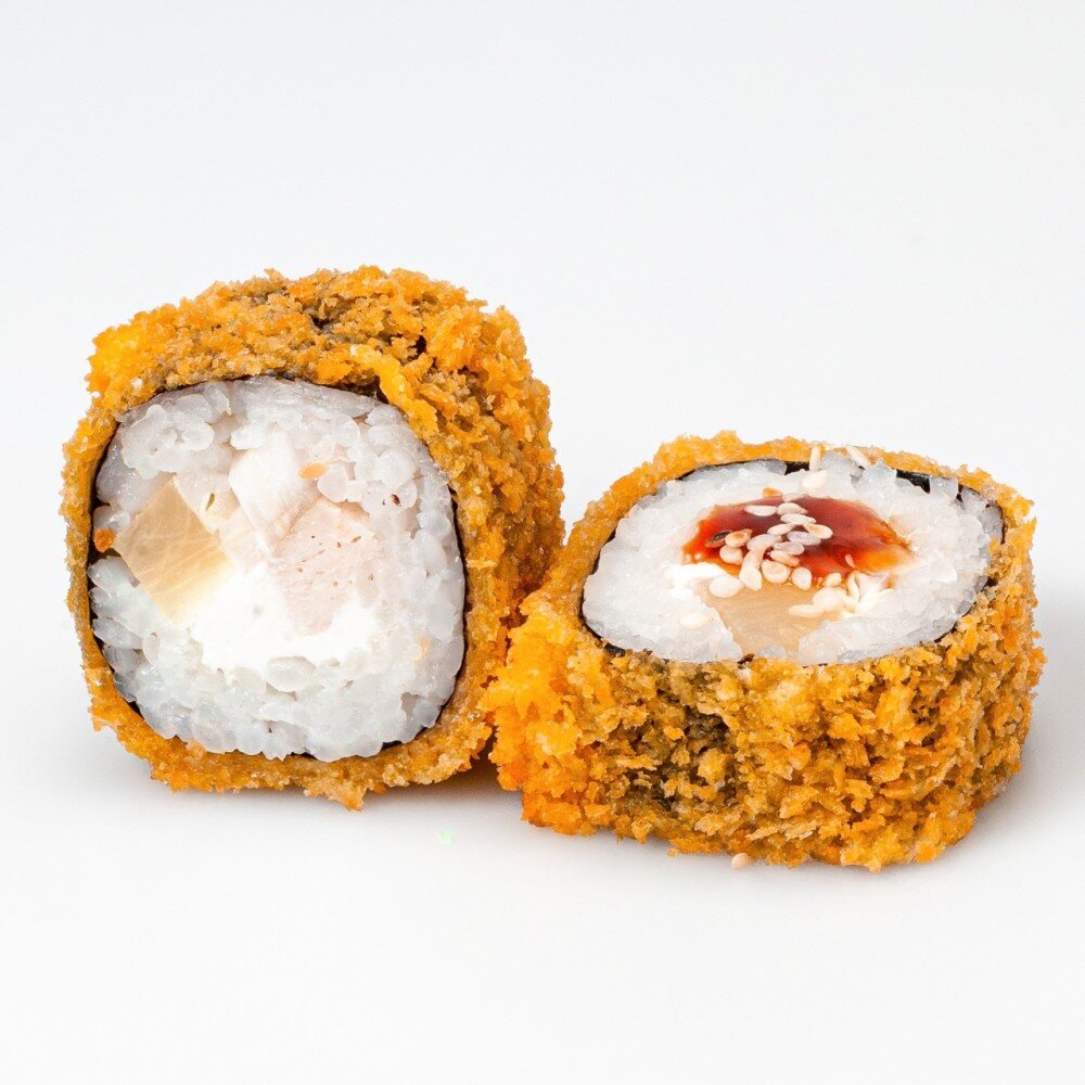 Сливочный сыр, рис,жареная курочка, ананас, салат, кляр, сухари «Панко», полит соусом «Унаги», кунжут