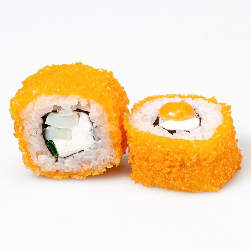 Сливочный сыр, рис,кальмар, зеленый лук, кляр, сухари «Панко», полит соусом «Спайси»