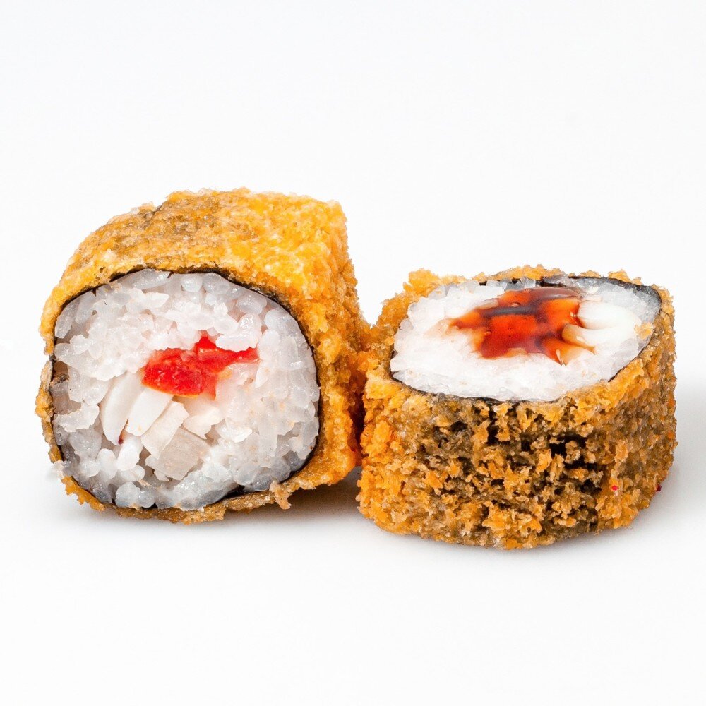 Кальмар, помидор, пекинка, рис,кляр, «Панко», полит соусом «Унаги»